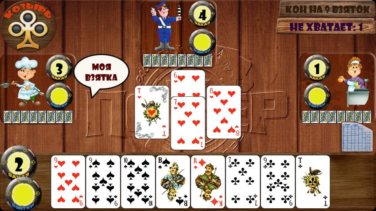 - Ответить картой той же масти, либо младшей, либо старшей. Если номинал карты ниже, то она теряется, если наоборот, то берется взятка.