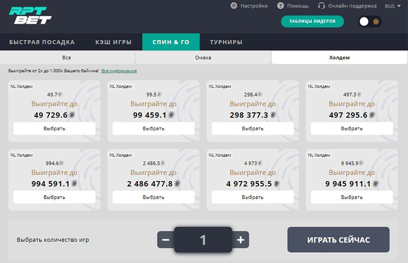 Ивенты Spin&Go проходят на разных лимитах — от микро до хай. Поэтому минимальная сумма регистрации составляет 50 ₽, максимальная — 1,000 ₽. Гарантия в первом случае может достигать 50,000 рублей, во втором — 10 миллионов руб.
