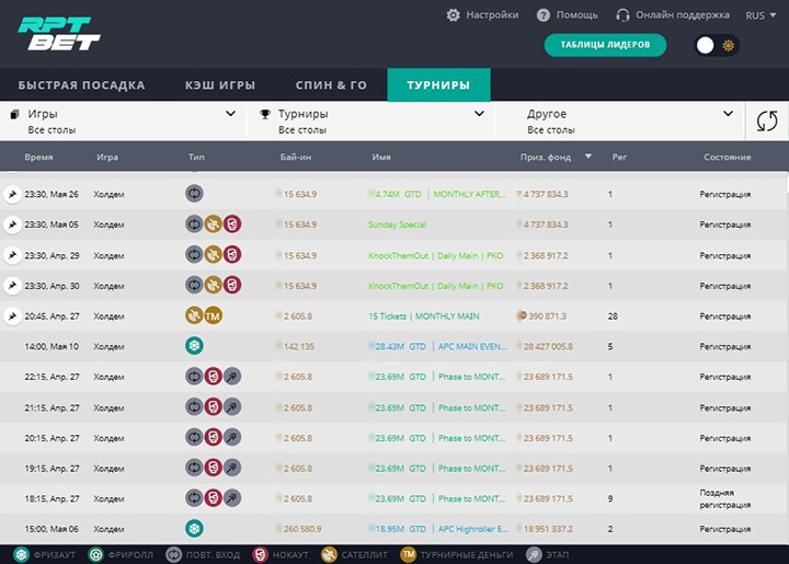 Ежедневно в покерной комнате проходит по 30-50 многостоловых ивентов. Участвовать в них можно с любым уровнем банкролла, поскольку взносы представлены в широком диапазоне — от 35 ₽ до 5,400 ₽.