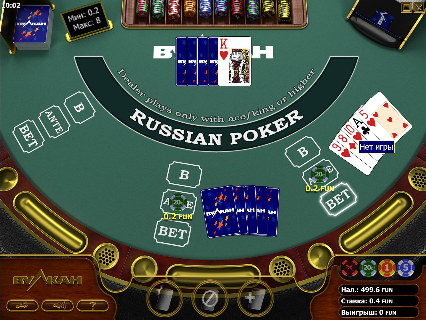 Затем пользователь обязан сделать ставку – Анте, она выставляется в специальную ячейку. В каждом заведении ее размер устанавливается индивидуально, диапазон обычно составляет от 1 до 100 фишек.