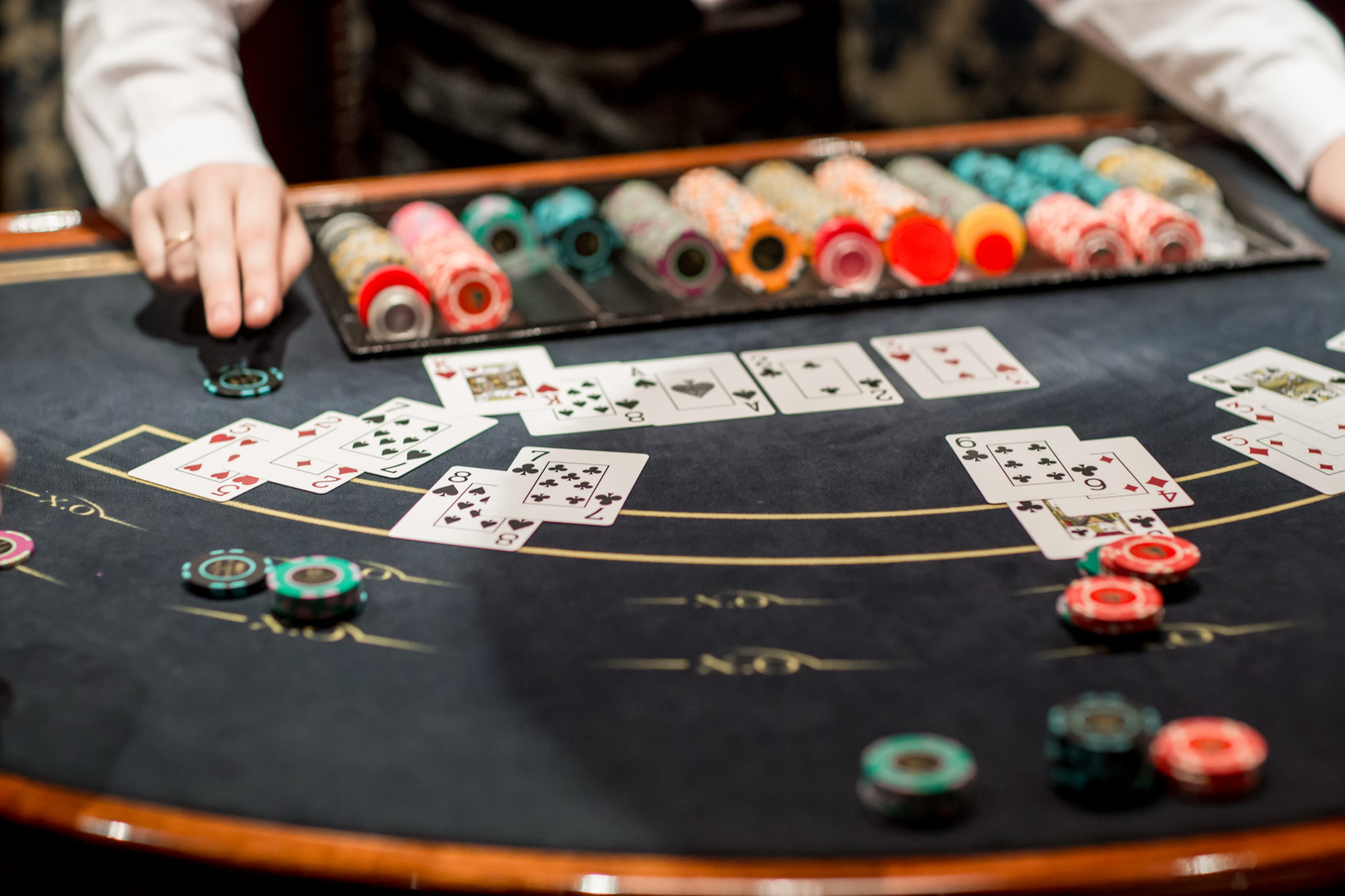 Далее и игроку и дилеру раздаются по пять карт. Причем у пользователя все карты в закрытом виде, а один элемент крупье выставляется в открытом виде. До сих пор идут споры, помогает ли это участнику или же, наоборот, вводит в заблуждение.
