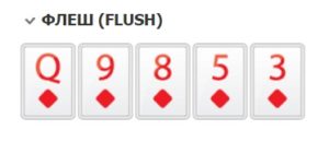 Посередине располагается Флеш. Это пять карт одной масти, но разного номинала (король, валет, шестерка, восьмерка, дама – Флеш от короля, название от самой высокой по рангу карты).