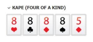 Начинается сильная группа Каре – комбинация из четырех карт одинакового ранга. Пятая выступает в роли дополнительной и учитывается в редчайших случаях (четыре короля, четыре дамы, например).