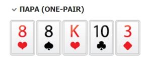 Открывает выигрышные комбинации в покере Пара – сочетание 2 карт с одинаковым достоинством (две десятки или два вальта, например). Плюс три карты дополнительные.