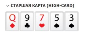 Выиграть со Старшей картой значительные суммы обычно возможно только за столом с неопытными игроками. Если у всех эта комбинация, оценивается номинал карт, у кого он выше, тот и празднует победу. При равенстве учитываются все пять карт.