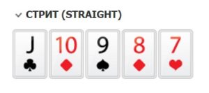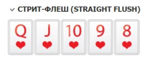 Следующим идет Стрит Флеш. Это комбинация из пяти последовательных карт одной масти (5,6,7,8,9 бубен, например).