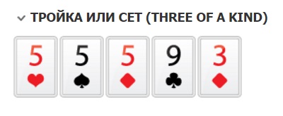 Замыкает слабую группу Сет, или по другому Тройка, Трипл. Составляется из трех карт с одинаковым достоинством (три дамы, три восьмерки, например). Еще две карты являются дополнительными.