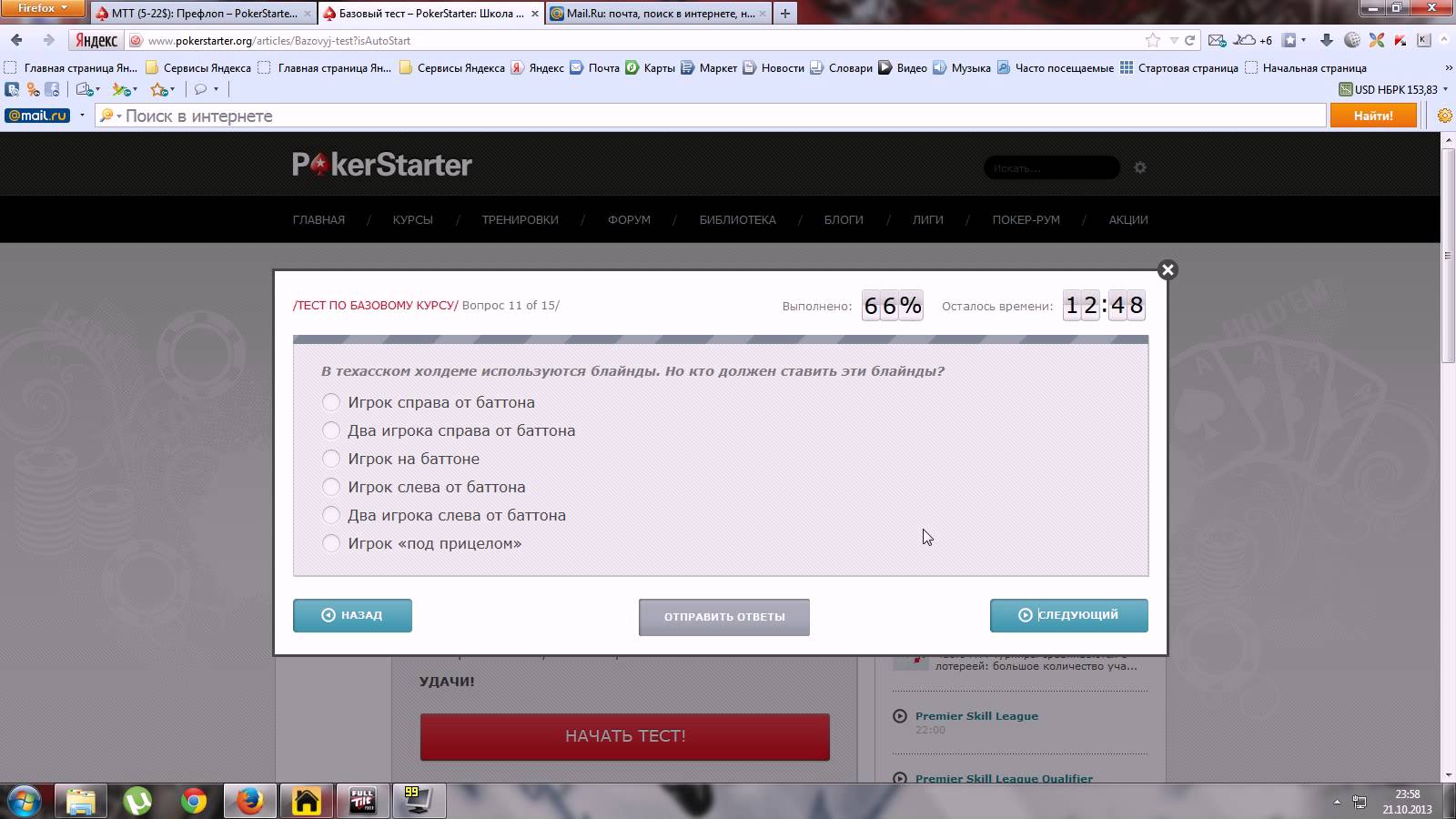 Открывается обучение с помощью специального тестового задания для определения уровня знаний основных покерных правил и терминов. При отсутствии элементарных познаний, школа обучит всем базовым элементам совершенно бесплатно. Это поможет начать карьеру покеристу с нуля. Качественные материалы и методика работает намного эффективней, чем самостоятельные попытки освоить покер.