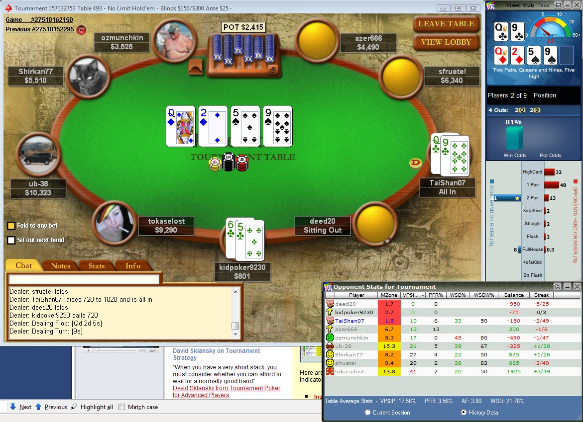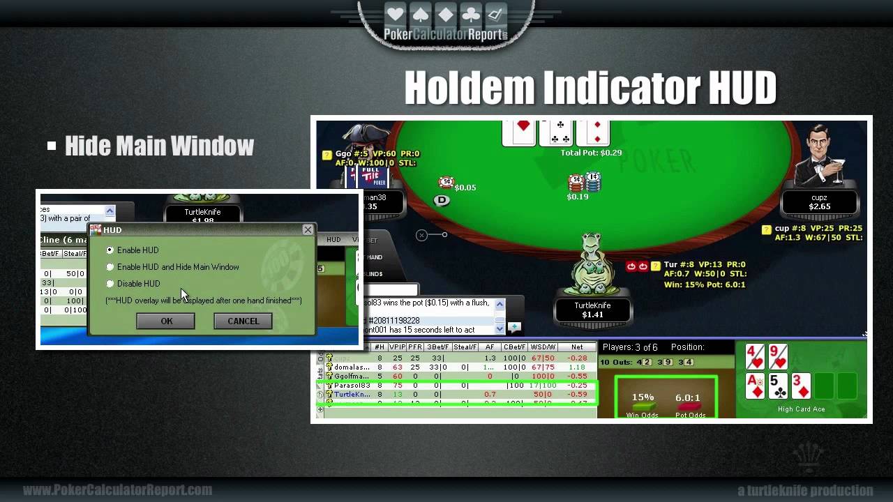 Tournament Indicator также выводит информацию и по оппонентам и дает анализ их рук. В нем есть встроенный калькулятор эквити и возможность смотреть карты, отправленные в пас.