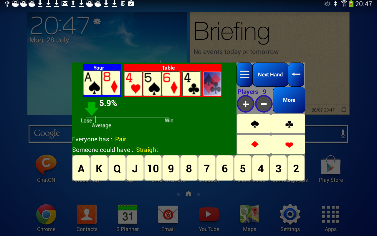 Выигрыш в покере зависит не только от удачи, но и от того, как правильно игрок умеет считать шансы банка и вероятности собрать комбинации. Ошибка в подсчетах может дорого обойтись, чтобы этого не случилось, следует скачать покерный калькулятор и пользоваться им во время ответственных игр.