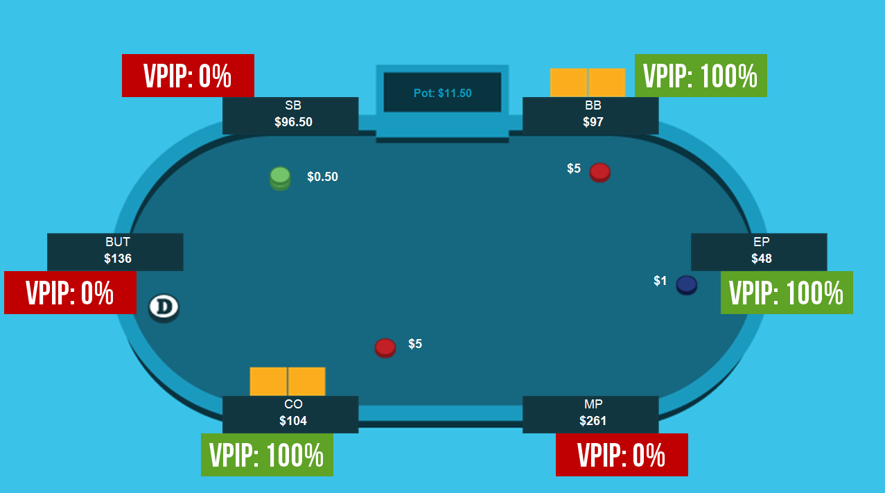 - VPIP. Показатель входа в игру покериста с рейзом или коллом. Если процентное соотношение равно 8-12 процентам, то противник тайтово-агрессивный.