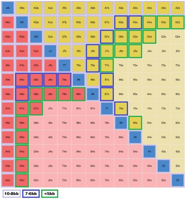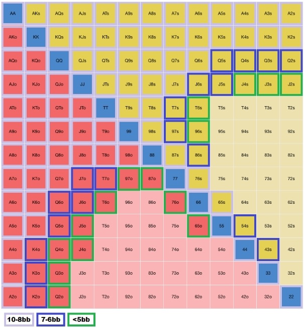 Чем меньше остается стек, тем шире будет диапазон пуша. 8-10бб – нужно идти олл-ин с руками, обозначенными серым цветом, 6-7бб – с руками синего цвета, менее 5бб – с руками синего, серого и зеленого цвета.