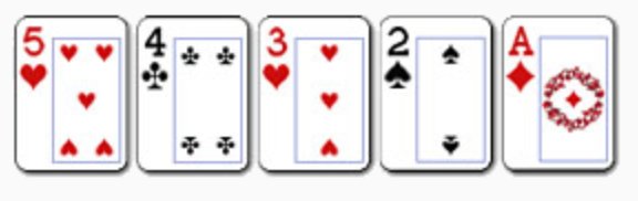 - Выпал Стрит в варианте – туз, 2,3,4,5 у двух или нескольких игроков. Ситуация аналогичная первой, выигрыш выплачивается покеристам равными частями.