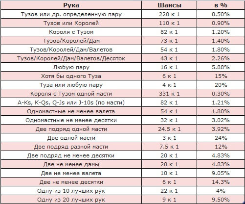 В первую очередь нужно знать, какие карты и с какой вероятностью можно получить в раздаче. Если придут пара тузов или королей, то это дает большое преимущество перед оппонентами, но при этом они выпадут лишь в одном случае из 220. В то время как обычные одномастные карты раздаются в 24% случаев, то есть в трети партий появляется неплохой шанс усилиться до Флэш.