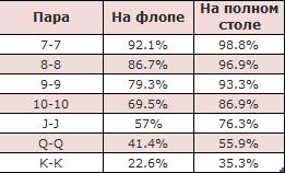 Не менее важно знать, с какой частотой придет оверкарта к карманной паре. Если к борду складывается хорошая позиция, то повышаются шансы на победу в партии. Вот соответствующая таблица.