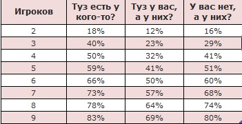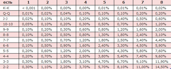 Очень важно уметь считать вероятности получить карманную пару в зависимости от количества оппонентов. Число противников тоже играет большую роль при выстраивании стратегии. Подобная таблица выглядит следующим образом.