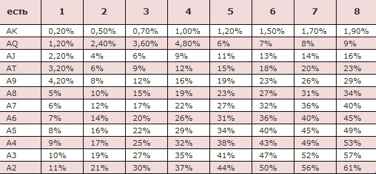 Туз – весомый аргумент в пользу победы в раздаче. Но стоит обращать внимание и на вторую карманную карту, ведь от нее тоже многое зависит. Ниже таблица с вероятностью получить туз с любым другим элементом в зависимости от количества оппонентов за столом.