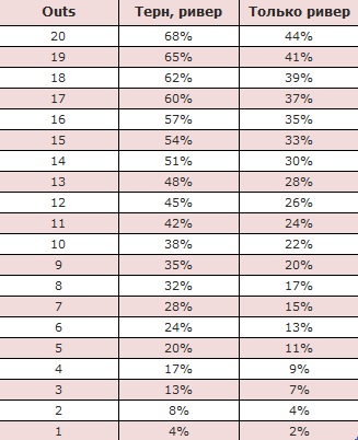 Обязательно стоит рассмотреть таблицу с шансами усилиться на терне и ривере. Здесь от игрока потребуется знание числа аутов, впрочем, посчитать их несложная задача. Например, на борде есть две пиковые карты, на руках еще две, очевидно, что нужен всего лишь один элемент, чтобы составить Флэш. Всего в колоде 13 карт одной масти, 4 из них уже в игре, значит, количество аутов будет равняться 9 (13-4). В таблице ниже приведены вероятности на постфлопе.
