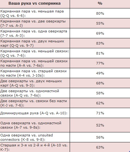 В безлимитном Техасском Холдеме нередки ва-банки. Но всегда ли подобный ход оправдан? Принять решение пойти алл-ин намного проще, если взглянуть на следующую таблицу шансов: