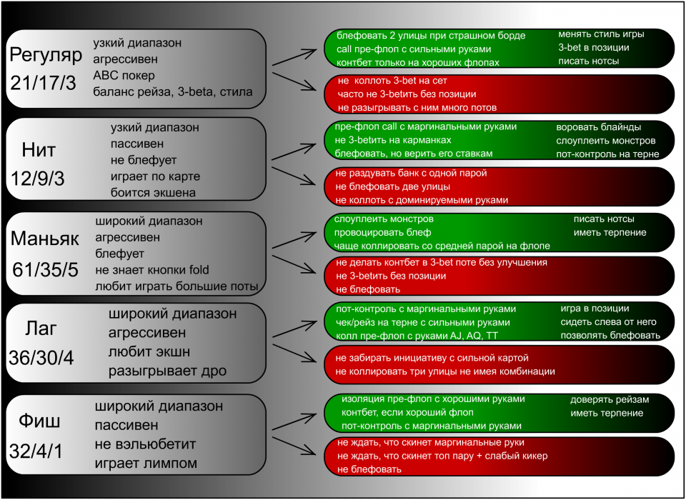 Зная об особенностях игры противника, выбор стратегии значительно упрощается. Против «агрессоров» нужно играть осторожно, выбирая только сильные руки для финального вскрытия. После пары неудач пыл соперника охладится и он, возможно, покинет стол.