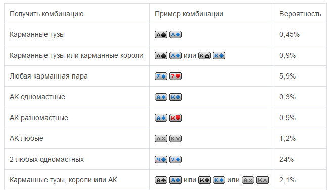 Впрочем, на данный момент есть таблица вероятности в покере, ей можно пользоваться, чтобы не производить расчеты самостоятельно. Один из вариантов представлен ниже.