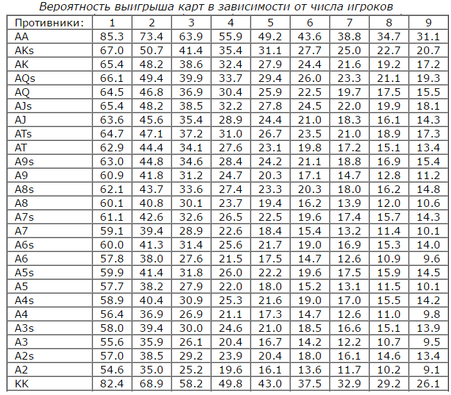 Дополнительно можно пользоваться таблицей, в которой приведены расчеты по шансам одержать победу против разного количества противников различными руками. Они верны при условии, что оппоненты на префлопе сделали олл-ин.