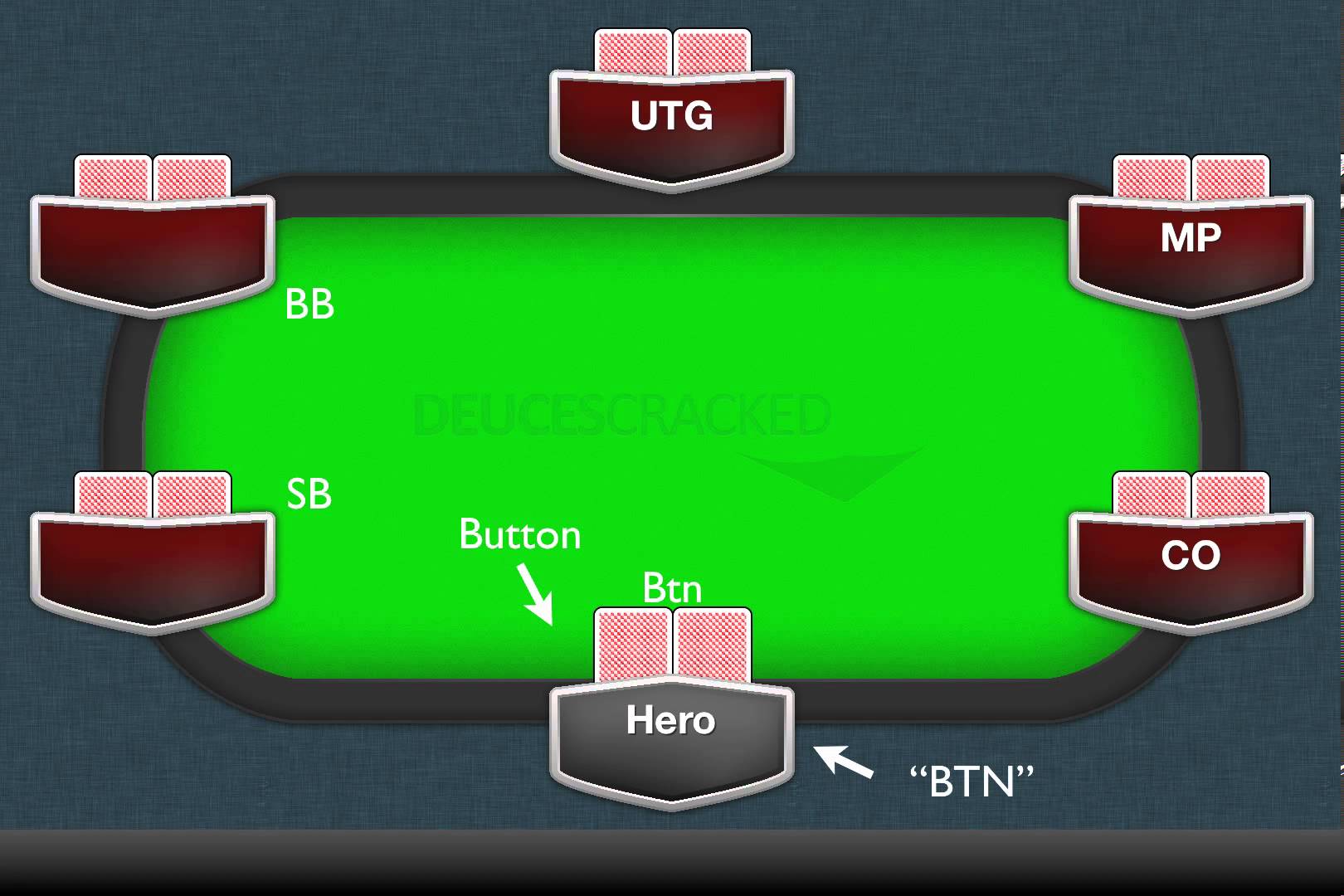 UTG – место игрока, который сидит слева от большого блайнда, он делает первый ход на префлопе. В зависимости от количества участников, меняется число таких позиций: за столами до 6 игроков УТГ только один, а в состязаниях на 10 игроков, есть еще УТГ-1, УТГ-2 и УТГ-3.