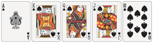 - Роял Флеш. По сути это старший Стрит Флеш, состоит из пяти карт одной масти, начинающихся 10 и заканчивающихся тузом. Пример: 10 червей, валет червей, дама червей, король червей, туз червей.